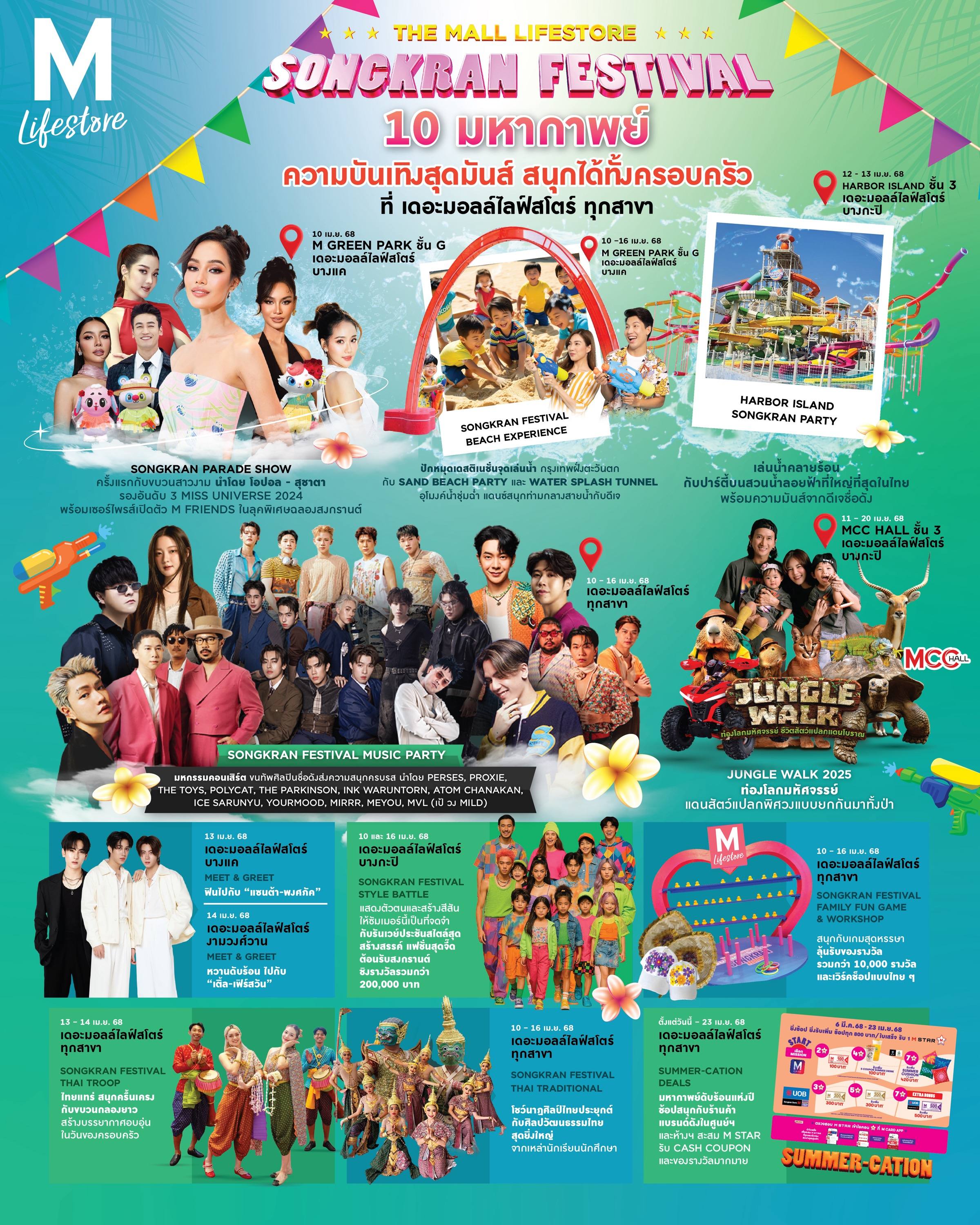 เดอะมอลล์ไลฟ์สโตร์ ชวนร่วมฉลองเทศกาลสงกรานต์ 2568 ในงาน “THE MALL LIFESTORE SONGKRAN FESTIVAL 2025 มหากาพย์สงกรานต์ สาดความสุข สนุกทั้งครอบครัว” ระหว่างวันที่ 10-16 เมษายน นี้ กับมหากาพย์กิจกรรมความบันเทิงสุดมันส์สนุกได้ทั้งครอบครัว พร้อมพาเหรดทัพศิลปินคนดังร่วมสาดความสุข ที่เดอะมอลล์ไลฟ์สโตร์ทุกสาขาทั่วกรุงเทพฯ และครั้งแรกกับการจำลอง ‘บีช เพลย์กราวน์’ ยาวกว่า 15 เมตร พร้อมอุโมงน้ำยาวกว่า 20 เมตร บริเวณ M GREEN PARK ด้านหน้าศูนย์การค้าเดอะมอลล์ไลฟ์สโตร์ บางแค เพิ่มสีสันปักหมุดจุดเชคอินเล่นน้ำสงกรานต์ของโซนกรุงเทพฯ ฝั่งตะวันตก พร้อมด้วยหลากหลายกิจกรรมและโปรโมชั่น กิน ช้อป เที่ยว แบบครบครันสามารถใช้เวลาได้ทั้งวันในวันสงกรานต์ที่เหมาะสำหรับทุกครอบครัว ทุกไลฟ์สไตล์ ทุกเจเนอเรชั่น