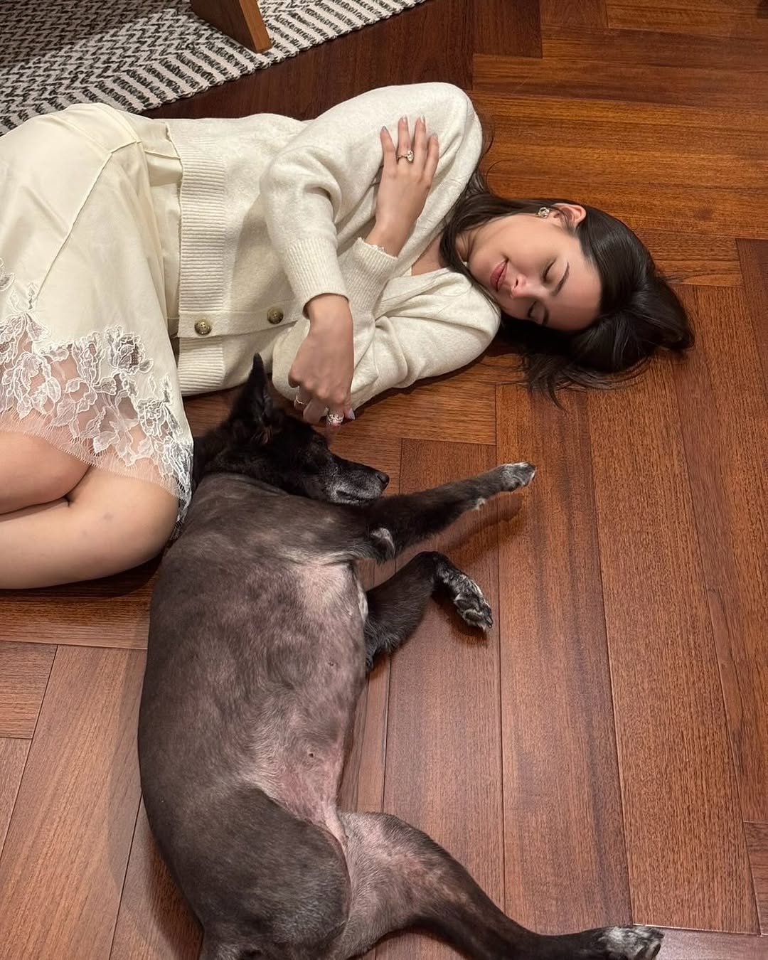 และภาพที่น่ารักคูณสองคือ ญาญ่า นอนกับพื้นเกลือกกลิ้งคู่กับ เย็นเย็น เจ้าตูบสามขาสุดที่รักของบ้านณเดชน์ กับอีกภาพคือ แม่ปลา นั่งเกาคอให้ เย็นเย็น