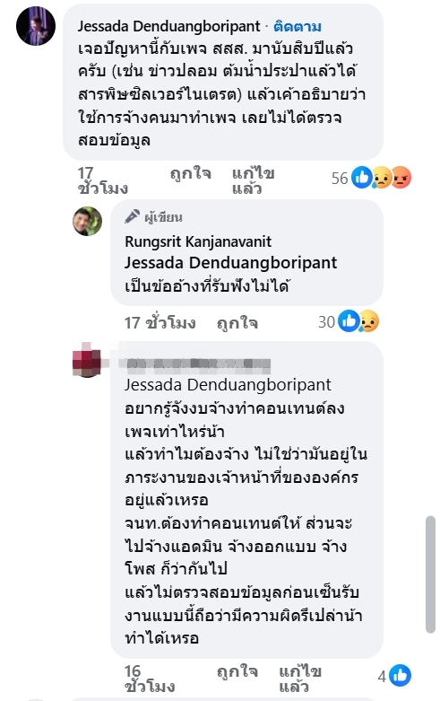 หนึ่งในผู้ที่เข้ามาแสดงความคิดเห็นคือ รศ. ดร. เจษฎา เด่นดวงบริพันธ์ นักวิทยาศาสตร์และอาจารย์จากจุฬาลงกรณ์มหาวิทยาลัย ที่ระบุว่า เจอปัญหานี้กับเพจ สสส. มานับสิบปีแล้วครับ (เช่น ข่าวปลอม ต้มน้ำประปาแล้วได้สารพิษซิลเวอร์ไนเตรต) แล้วเค้าอธิบายว่า ใช้การจ้างคนมาทำเพจ เลยไม่ได้ตรวจสอบข้อมูล .. กรรม ซึ่งหมอหม่องก็ได้ตอบกลับคอมเมนต์ว่า "เป็นข้ออ้างที่รับฟังไม่ได้"