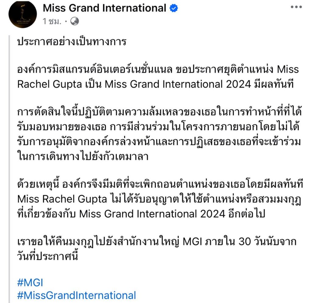 ด้วยเหตุนี้ องค์กรจึงมีมติที่จะเพิกถอนตําแหน่งของเธอโดยมีผลทันที Miss Rachel Gupta ไม่ได้รับอนุญาตให้ใช้ตําแหน่งหรือสวมมงกุฎที่เกี่ยวข้องกับ Miss Grand International 2024 อีกต่อไป เราขอให้คืนมงกุฎไปยังสํานักงานใหญ่ MGI ภายใน 30 วันนับจากวันที่ประกาศนี้