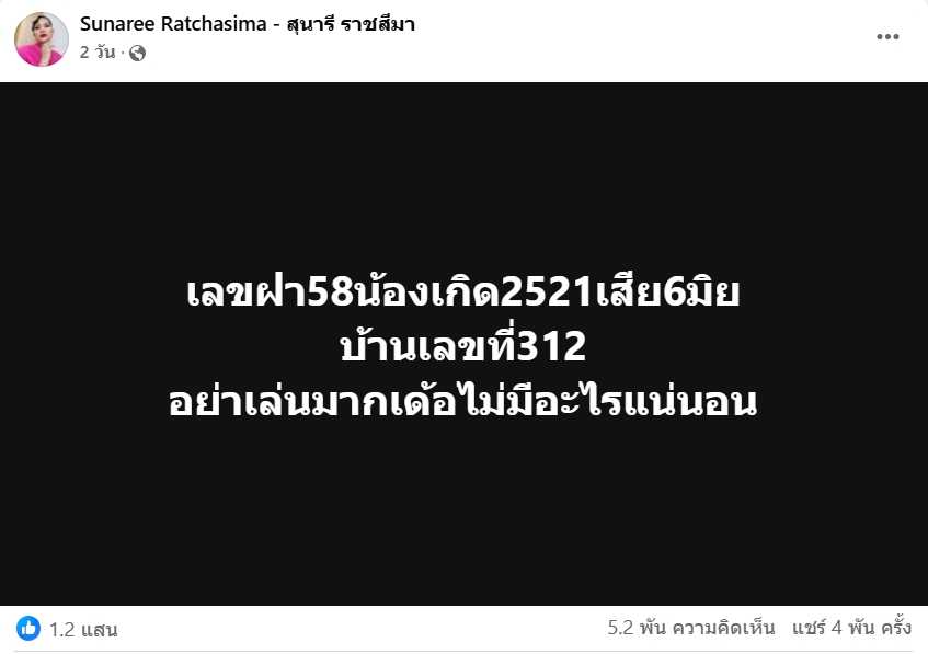 และท่ามกลางความเศร้า ต่อมา สุนารี ก็ยังได้ออกมาโพสต์แคปชั่นให้เลขเด็ดกับแฟนๆ ไว้กับแคปชั่นว่า "เลขฝา58น้องเกิด2521เสีย 6 มิย บ้านเลขที่ 312 อย่าเล่นมากเด้อไม่มีอะไรแน่นอน"