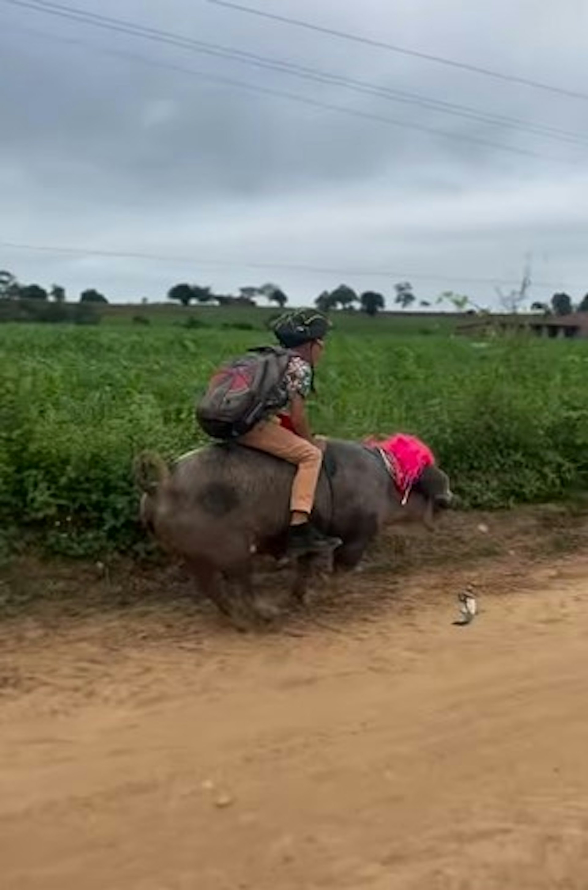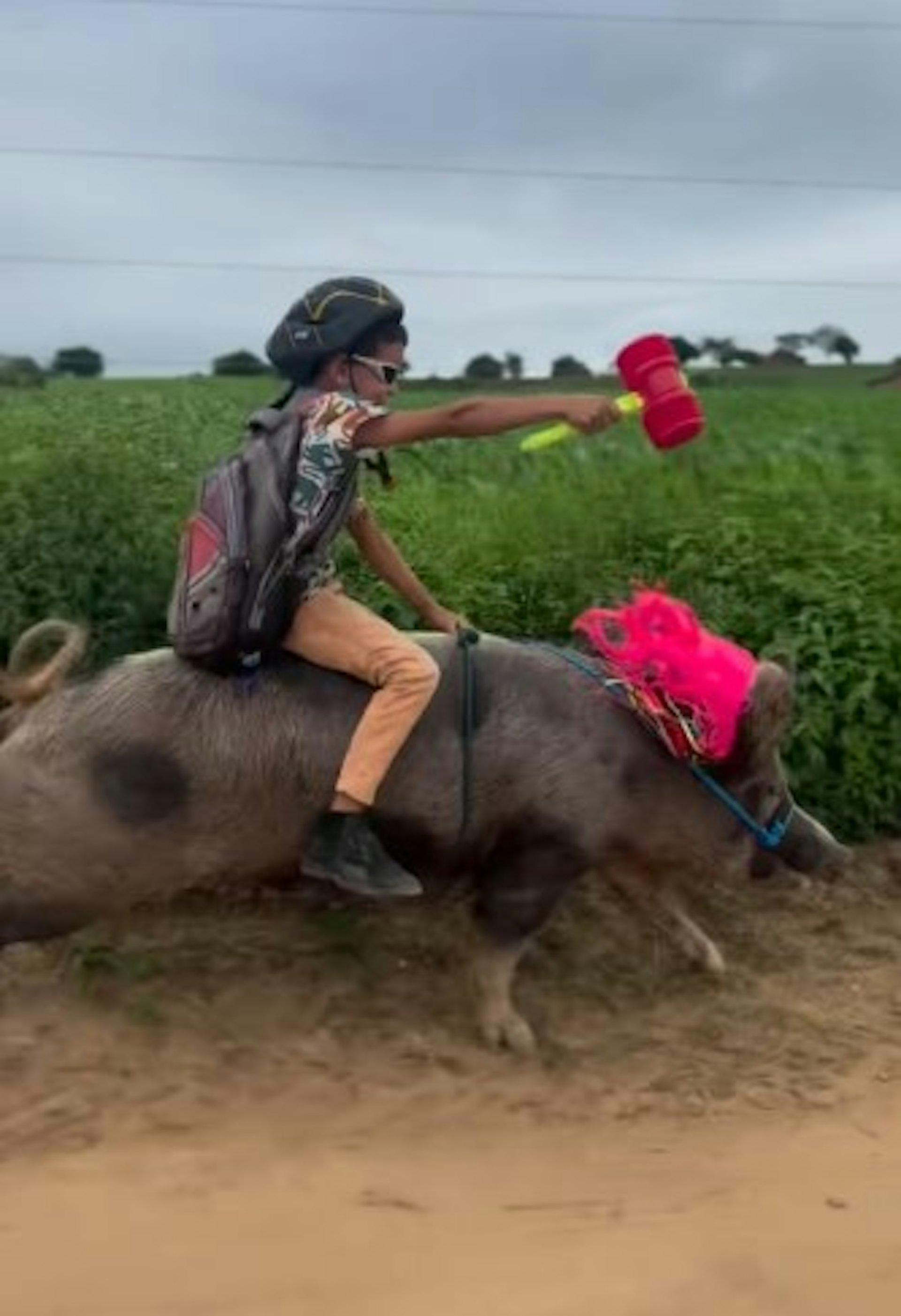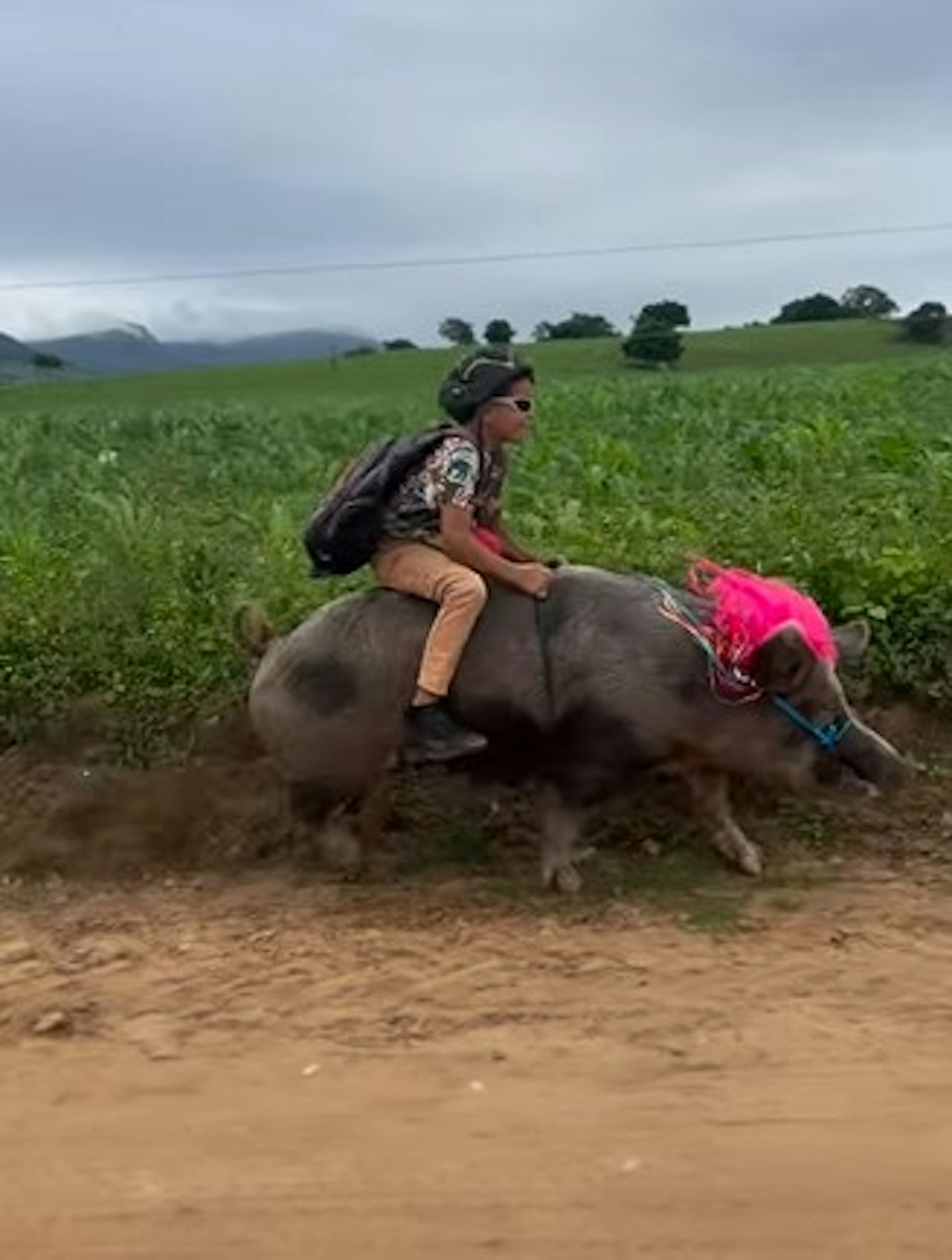 อ่านไม่ผิด! เด็กชาย 9 ขวบ ขี่ "หมู" ไป-กลับโรงเรียน แค่ 1 นาทีถึงที่หมาย (มีคลิป)เด็กชายวัย 9 ขวบ ขี่ "หมู" ไป-กลับโรงเรียน ใช้เวลาแค่ 1 นาทีถึงที่หมาย คลิปไวรัลฮือฮาทั่วโลกโซเชียล ชาวเน็ตแห่ชม “การเดินทางสายอีโค่ตัวจริง”