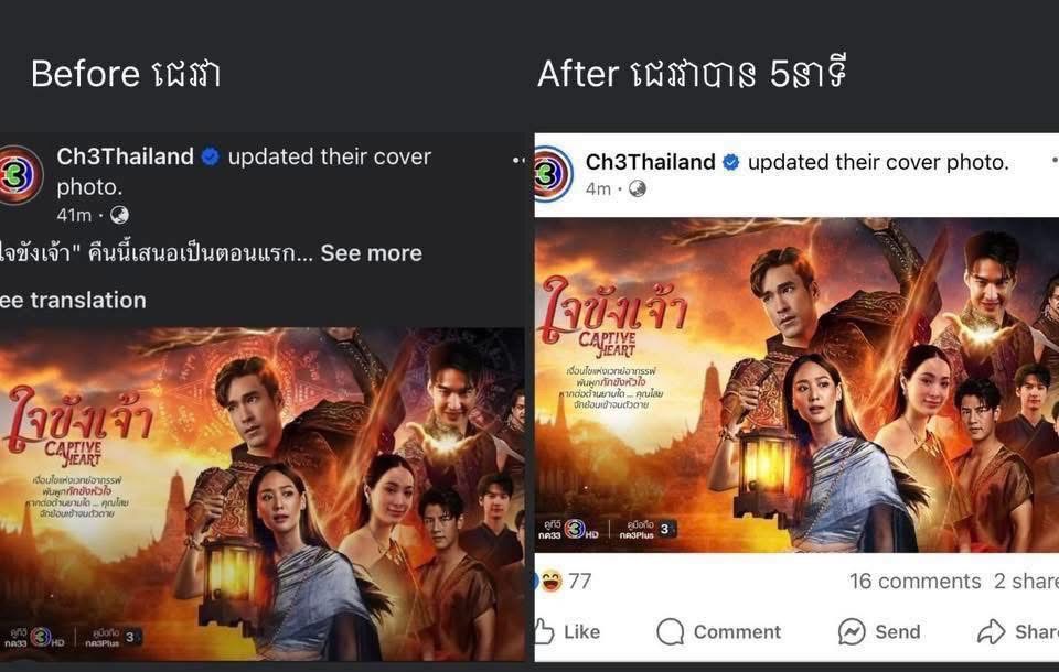 เจอเคลมแล้ว "ใจขังเจ้า" เขมรบุกใต้โพสต์ช่อง 3 อ้างสิทธิ์การแต่งกาย และรอยสักของณเดชน์!เจอเคลมแล้ว "ใจขังเจ้า" ชาวเน็ตเขมรป่วนโพสต์ละครช่อง 3 เมนต์อ้างสิทธิ์เรื่องการแต่งกายและรอยสัก