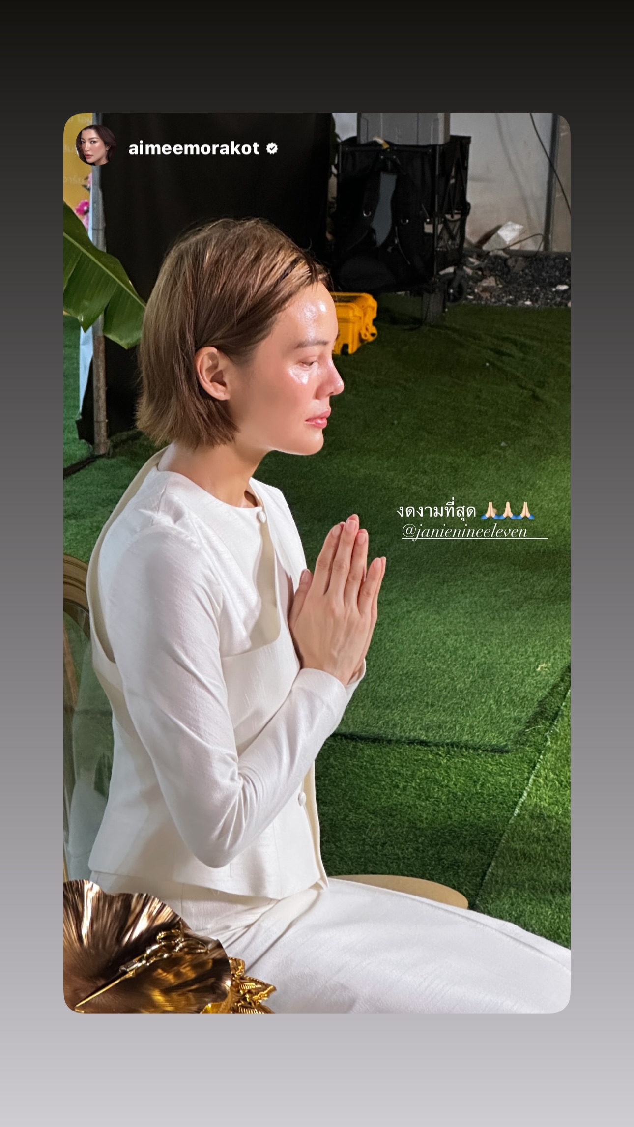 จากนั้น เจนี่ ได้เข้าพิธีอุปสมบทและทำโปรยทานในชุดขาว ต้องบอกว่าเป็นภาพที่งดงามมากที่สุด