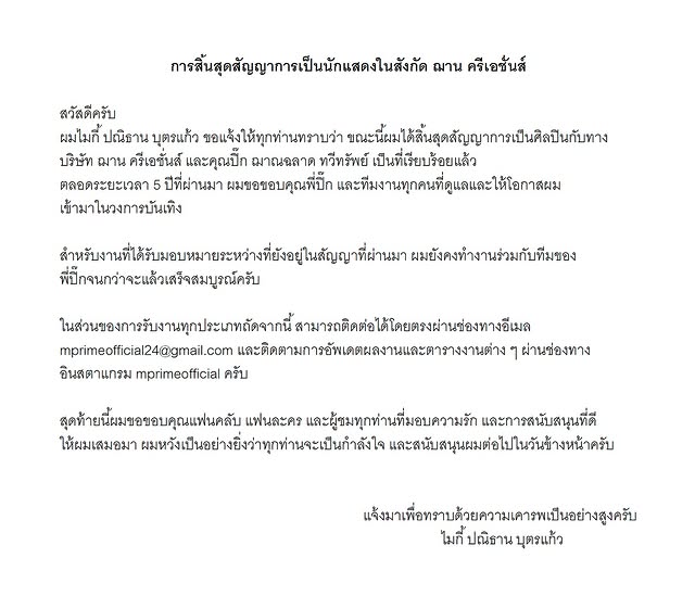 "ไมกี้ ปณิธาน" ประกาศแยกทาง "พี่ปิ๊ก ฌาณฉลาด" หลังร่วมทาง 5 ปี แฟนๆ แห่ซัพพอร์ตแน่นหลังร่วมงานกันมายาวนาน "ไมกี้ ปณิธาน" ประกาศชัด สิ้นสุดสัญญากับ "พี่ปิ๊ก ฌาณฉลาด" พร้อมเปิดใจถึงเส้นทางใหม่ในวงการบันเทิง ขณะที่แฟนคลับแห่ส่งกำลังใจแน่นโซเชียล