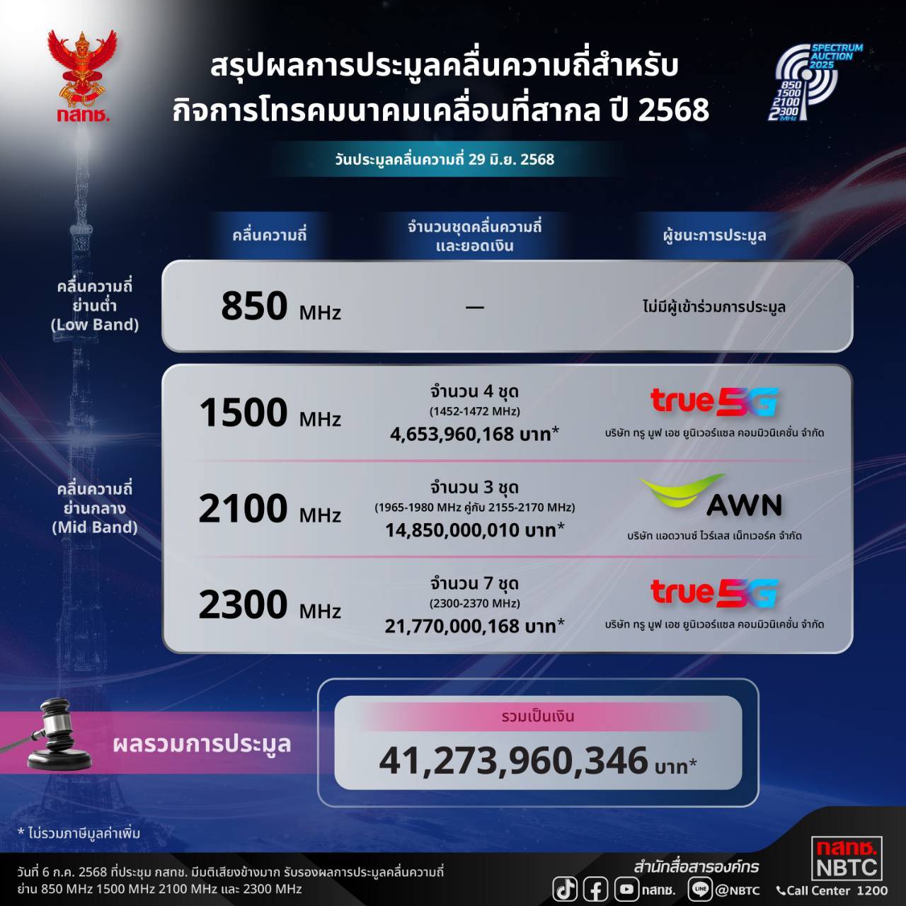 เมื่อวันที่ 6 กรกฎาคม 2568 คณะกรรมการกิจการกระจายเสียง กิจการโทรทัศน์ และกิจการโทรคมนาคมแห่งชาติ (กสทช.) มีมติเสียงข้างมาก 5:1:1 รับรองผลการประมูลคลื่นความถี่อย่างเป็นทางการ ครอบคลุมย่าน 850 MHz, 1500 MHz, 2100 MHz และ 2300 MHz ซึ่งการประมูลจัดขึ้นเมื่อวันที่ 29 มิถุนายนที่ผ่านมา