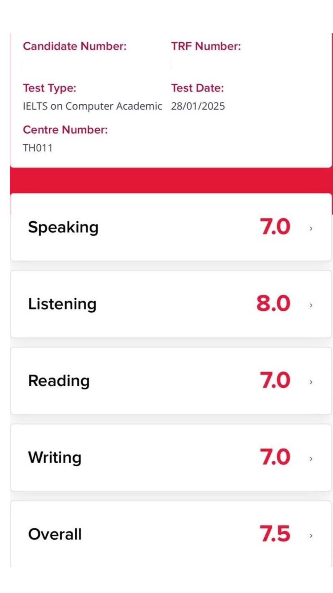 จ๋าได้คะแนนสอบตามที่ตั้งใจไว้เลยค่ะ จากคะแนนก่อนเรียนที่ 6.5 ได้เพิ่มเป็น 7.5 คะแนนเพิ่มขึ้นเยอะมาก ซึ่งเป็นสิ่งที่ทำให้มั่นใจในวิธีการเรียนของ PREP มากๆ