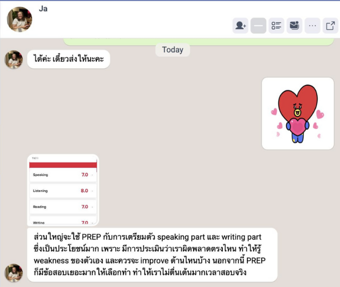 สิ่งที่จ๋าชอบมากคือ ห้องสอบเสมือนจริง (Virtual Room) ของ PREP ที่มีทั้ง Speaking และ Writing ซึ่งช่วยจำลองสถานการณ์สอบจริงได้อย่างครบถ้วน พร้อมคำแนะนำและฟีดแบ็กตลอดเวลา ทำให้รู้ได้ทันทีว่าควรแก้ไขจุดไหน และคำศัพท์หรือรูปแบบประโยคแบบไหนที่จะช่วยให้ได้คะแนนตามเกณฑ์ IELTS ที่เราต้องการ ทำให้จ๋าได้นำมาปรับใช้และแก้ไขได้ในเวลา 1 เดือน