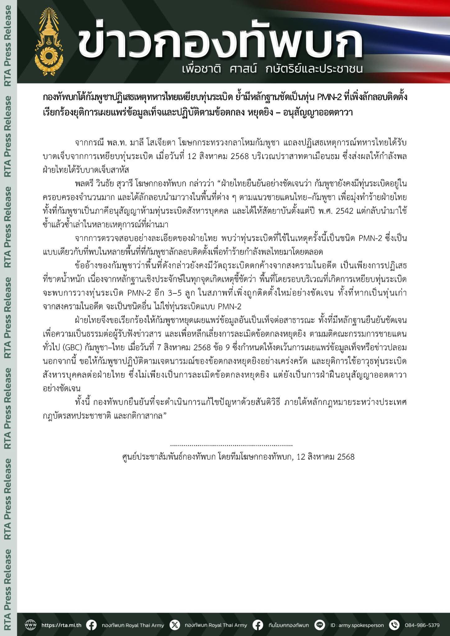 ฝ่ายไทยจึงขอเรียกร้องให้กัมพูชาหยุดเผยแพร่ข้อมูลอันเป็นเท็จต่อสาธารณะ ทั้งที่มีหลักฐานยืนยันชัดเจน เพื่อความเป็นธรรมต่อผู้รับฟังข่าวสาร และเพื่อหลีกเลี่ยงการละเมิดข้อตกลงหยุดยิง ตามมติคณะกรรมการชายแดนทั่วไป (GBC) กัมพูชา–ไทย เมื่อวันที่ 7 สิงหาคม 2568 ข้อ 9 ซึ่งกำหนดให้งดเว้นการเผยแพร่ข้อมูลเท็จหรือข่าวปลอม นอกจากนี้ ขอให้กัมพูชาปฏิบัติตามเจตนารมณ์ของข้อตกลงหยุดยิงอย่างเคร่งครัด และยุติการใช้อาวุธทุ่นระเบิดสังหารบุคคลต่อฝ่ายไทย ซึ่งไม่เพียงเป็นการละเมิดข้อตกลงหยุดยิง แต่ยังเป็นการฝ่าฝืนอนุสัญญาออตตาวาอย่างชัดเจน