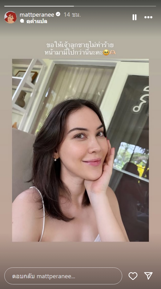 เอ็นดู! "แมท ภีรนีย์" โชว์ใบหน้า พร้อมคำอ้อนลูกชายในท้องอย่างน่ารักว่าที่คุณแม่คนสวย แมท ภีรนีย์ นับถอยหลังรอพบหน้าลูกชายคนแรก พร้อมเผยโมเมนต์สุดอบอุ่น โพสต์ภาพใบหน้าสดใสคู่คำอ้อนถึงเจ้าตัวน้อยในท้อง ที่ทำเอาแฟนๆ อดเอ็นดูไม่ได้