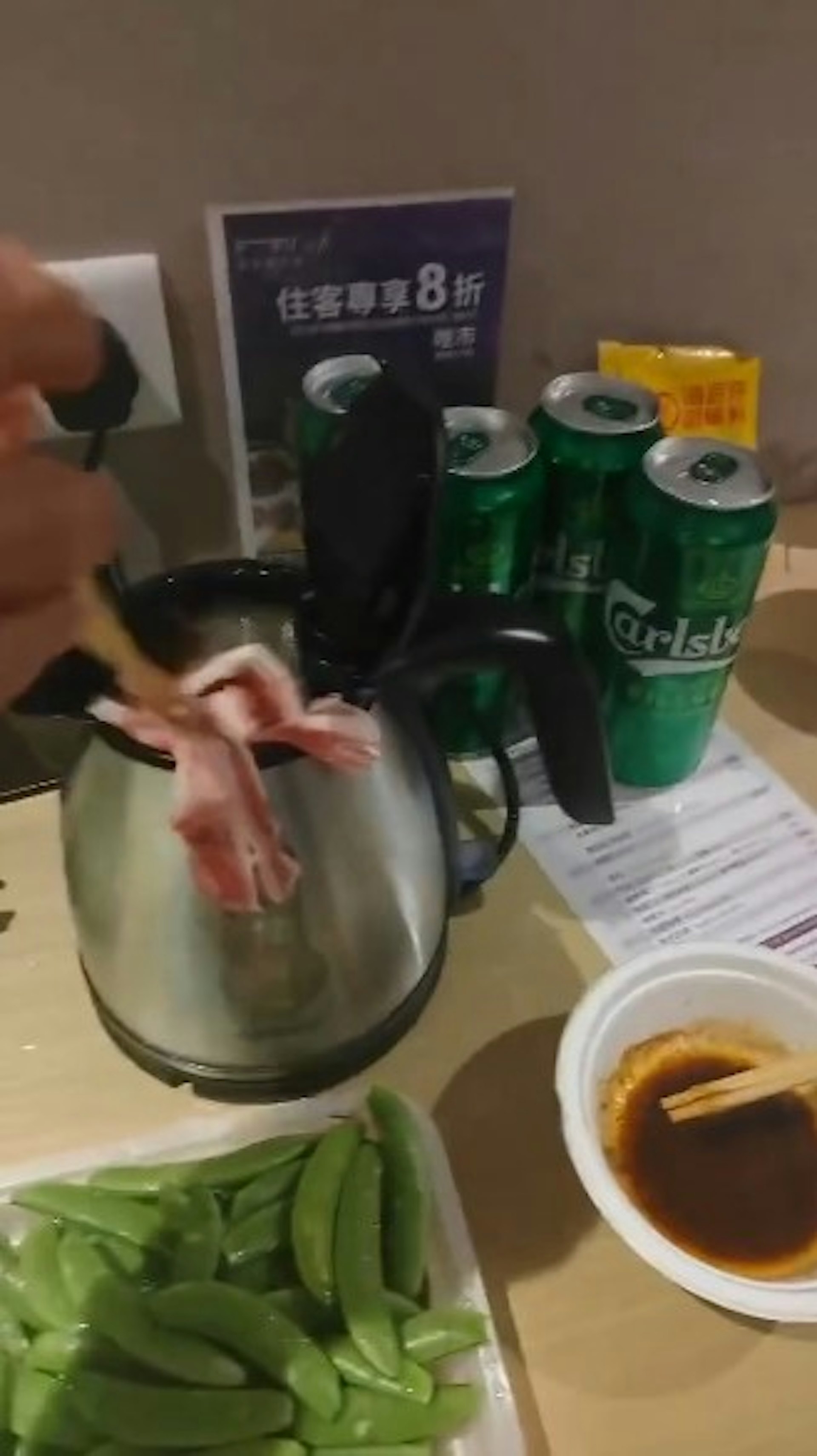 มีชาวเน็ตนำคลิปยาว 17 วินาทีมาโพสต์ซ้ำใน Threads ภายในคลิปเห็นว่ามี กาต้มน้ำ 2 ใบกำลังเดือดอยู่บนโต๊ะในห้องพักโรงแรม ขณะเดียวกันชายคนหนึ่งซึ่งเป็นคนถ่ายคลิปพูดขึ้นว่า “เคยกินชาบูหม้อไฟด้วยกาต้มน้ำไหม? อะไรก็ทำได้ทั้งนั้น”