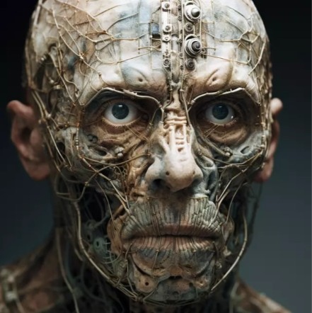 ตามภาพที่สร้างโดย Midjourney แฟชั่นแห่งอนาคตดูแปลกตาอย่างยิ่ง มนุษย์มีใบหน้าถูกปกคลุมด้วยโครงข่ายสายไฟ ราวกับสะท้อนถึงความสัมพันธ์แนบแน่นระหว่างมนุษย์กับเทคโนโลยีในอีกพันปีข้างหน้า เมื่อเทคโนโลยีได้ซึมลึกเข้าไปเป็นส่วนหนึ่งของร่างกายเราแล้ว