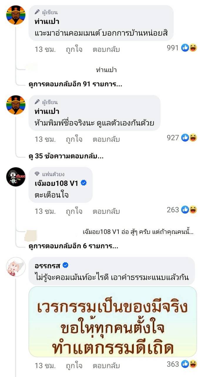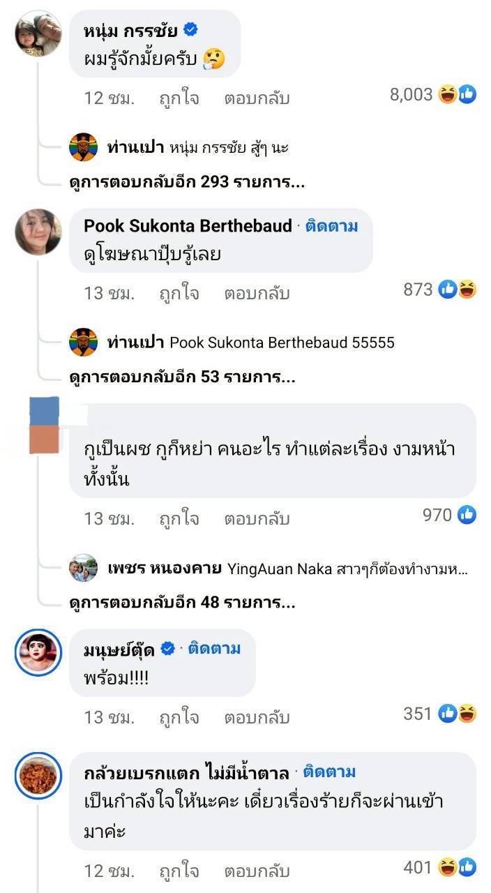 งานนี้ทำเอาเพจดังต่างๆ รวมไปถึงแฟนคลับเข้ามาคอมเมนต์กันยกใหญ่ ซึ่งหนึ่งในนั้นก็คือพิธีกรชื่อดังอย่าง หนุ่ม กรรชัย ที่พิมพ์ไว้ว่า "ผมรู้จักมั้ยครับ" โดยทางเพจ ท่านเปา ก็ได้เข้ามาตอบกลับสั้นๆ "สู้ๆ นะ"