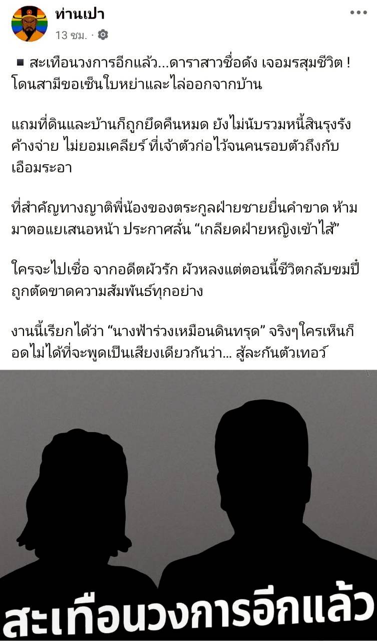 โดย ท่านเปา ได้เขียนข้อความไว้ว่า "สะเทือนวงการอีกแล้ว...ดาราสาวชื่อดัง เจอมรสุมชีวิต ! โดนสามีขอเซ็นใบหย่าและไล่ออกจากบ้าน แถมที่ดินและบ้านก็ถูกยึดคืนหมด