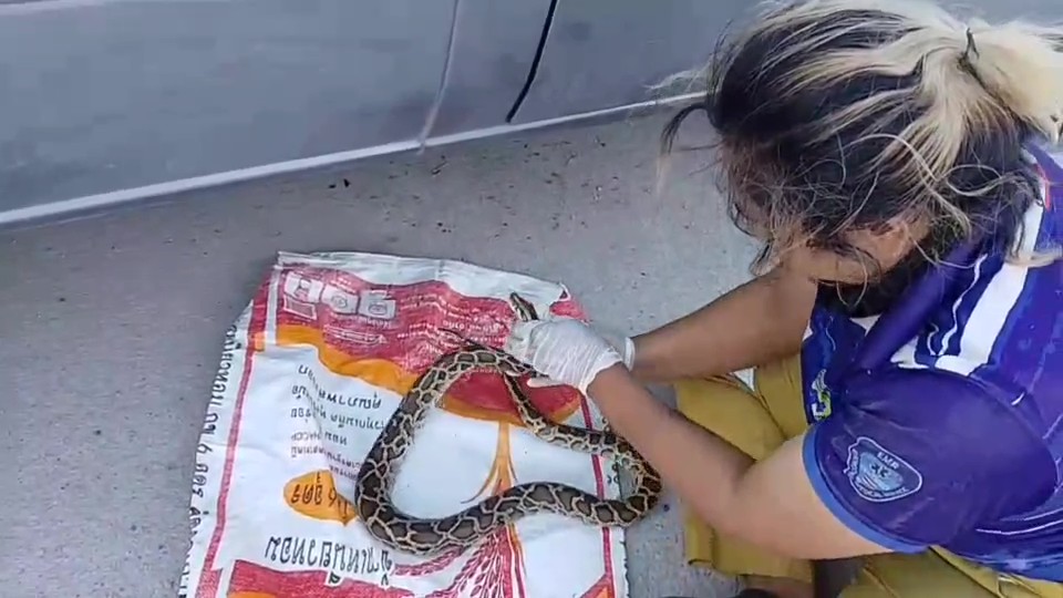 นางสาวปุ๊ก อายุ 33 ปี เจ้าหน้าที่กู้ภัยปลวกแดง เผยว่า งูตัวนี้เป็นงูหลามซึ่งตัวไม่ใหญ่มาก ความยาวประมาณ 1 เมตร เขาเลื้อยไปขดอยู่บริเวณแชสซีของรถ จึงทำให้ทุลักทุเลในการเอางูออกมา หลังจากนี้ก็จะเอาไปปล่อยคืนสู่ธรรมชาติ หาที่เป็นป่าไม่มีบ้านคนแล้วถึงจะปล่อย