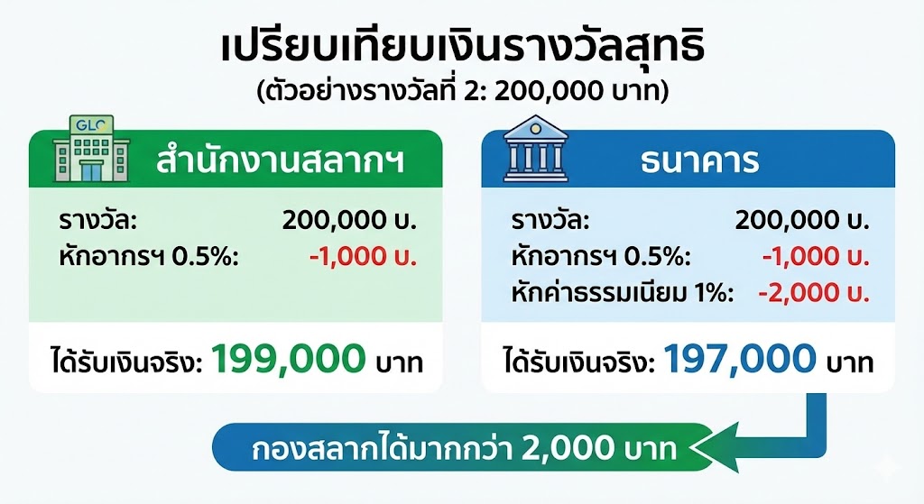 ถ้าถูกรางวัลไม่เกิน 2 ล้านบาท แนะนำไปธนาคารจะเร็วกว่ามาก เพราะไม่ต้องจองคิวและได้เงินภายในวันเดียว