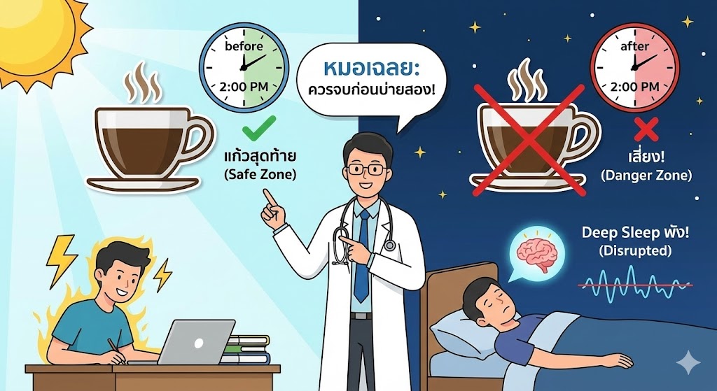 คุณหมอย้ำว่า "หลังเที่ยงงดกาแฟ คือกฎทอง" หลังจากบ่ายโมงไปแล้ว หากกระหายน้ำแนะนำให้ดื่มน้ำเปล่าดีที่สุด