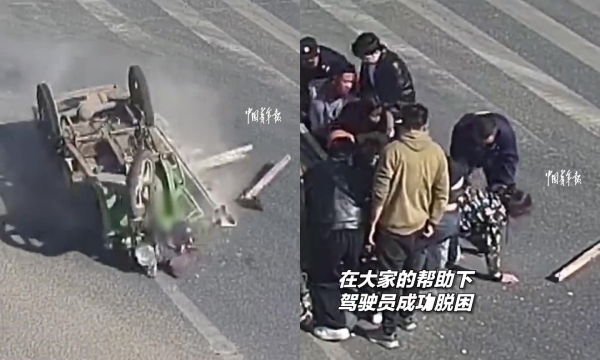 คลิปชีวิต! สาวซิ่ง 3 ล้อแหกโค้งทับร่าง พลเมืองดี "วิ่งกรูจากทุกทิศ" ช่วยยกรถราวปาฏิหาริย์นาทีระทึก! สามล้อพลิกคว่ำทับร่างคนขับ พลเมืองดีนับสิบวิ่งกรูช่วยยกรถ รอดปาฏิหาริย์