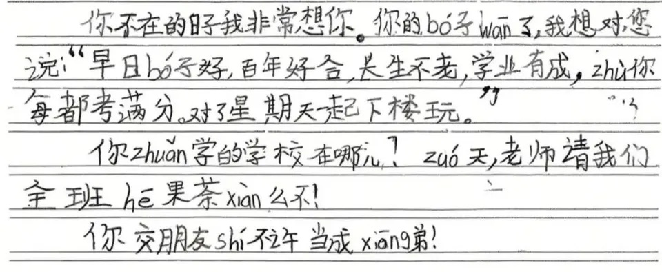 แปลไทยใจความว่า "ฉันเชื่อว่าเธอต้องคิดถึงพวกเราในห้องเรียนมากแน่ ๆ ฉันรู้สึกว่าเธอเป็นเพื่อนที่ดีกับพวกเรามากเลย ตอนอยู่ในห้องเรียน เธอมักตอบคำถามอย่างตั้งใจ พอพักเรียน เธอก็ชอบไปเล่นเกม ตอนที่เธอไม่อยู่ พวกเราคิดถึงเธอกันมากจริง ๆ