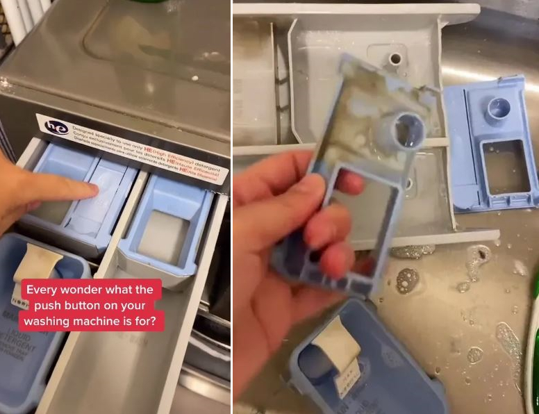 เธอกล่าวว่า "คุณเคยสงสัยไหมว่าปุ่มตรงนี้บนถาดใส่น้ำยาซักผ้ามีไว้ทำไม? ดูนี่นะ"