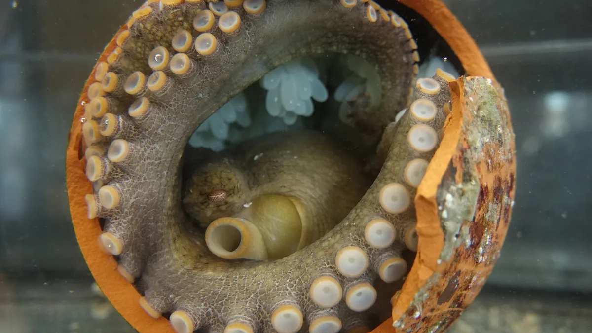 งานวิจัยล่าสุดที่ตีพิมพ์ในวารสาร Current Biology ศึกษาหมึกสายพันธุ์ California two-spot octopus พบความเปลี่ยนแปลงทางเคมีรุนแรงหลังวางไข่ ได้แก่