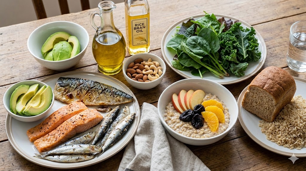 - ไขมันไม่อิ่มตัวตำแหน่งเดียว: น้ำมันมะกอก น้ำมันรำข้าว อะโวคาโด และถั่วเปลือกแข็ง (เช่น อัลมอนด์ เม็ดมะม่วงหิมพานต์) ช่วยลด LDL โดยไม่ไปลด HDL