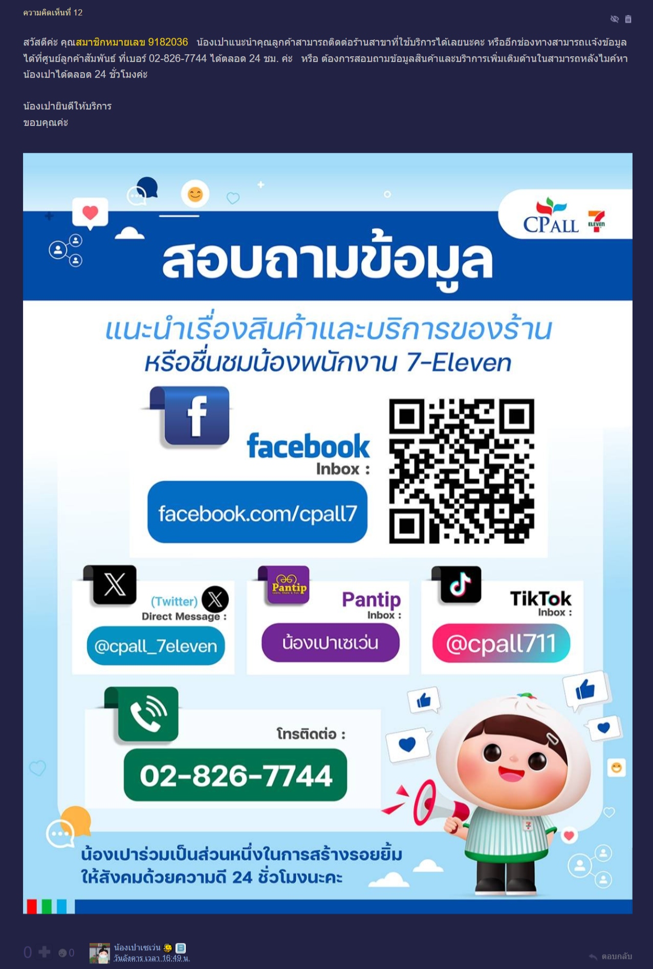 หลังตั้งกระทู้ไม่นาน “น้องเปาเซเว่น” ซึ่งเป็นแอคเคานต์อย่างเป็นทางการของทาง 7-11 ได้เข้ามาตอบว่า ลูกค้าสามารถติดต่อสอบถามกับสาขาที่ใช้บริการได้โดยตรง