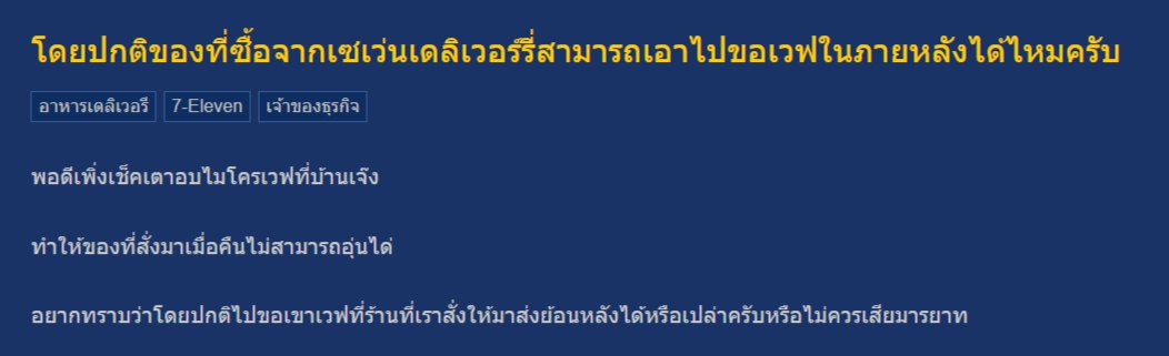 แม้จะไม่ใช่บริการที่ระบุไว้ชัดเจน แต่จากคำตอบของน้องเปาและประสบการณ์ของผู้ใช้จริง พบว่า การนำอาหารจาก 7-11 ไปขอเวฟภายหลัง “สามารถลองสอบถามสาขาได้” โดยเฉพาะหากมีใบเสร็จยืนยันการซื้อ