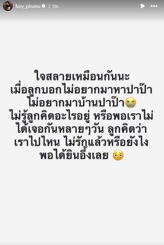 ล่าสุด บอย ภิษณุ ได้เขียนระบายความรู้สึกผ่านไอจีสตอรี่ เพราะต้องห่างลูกสาวสุดที่รัก จึงทำให้เกิดความรู้สึกห่างกันจนลูกไม่อยากมาหา ทำใจพ่อสลาย