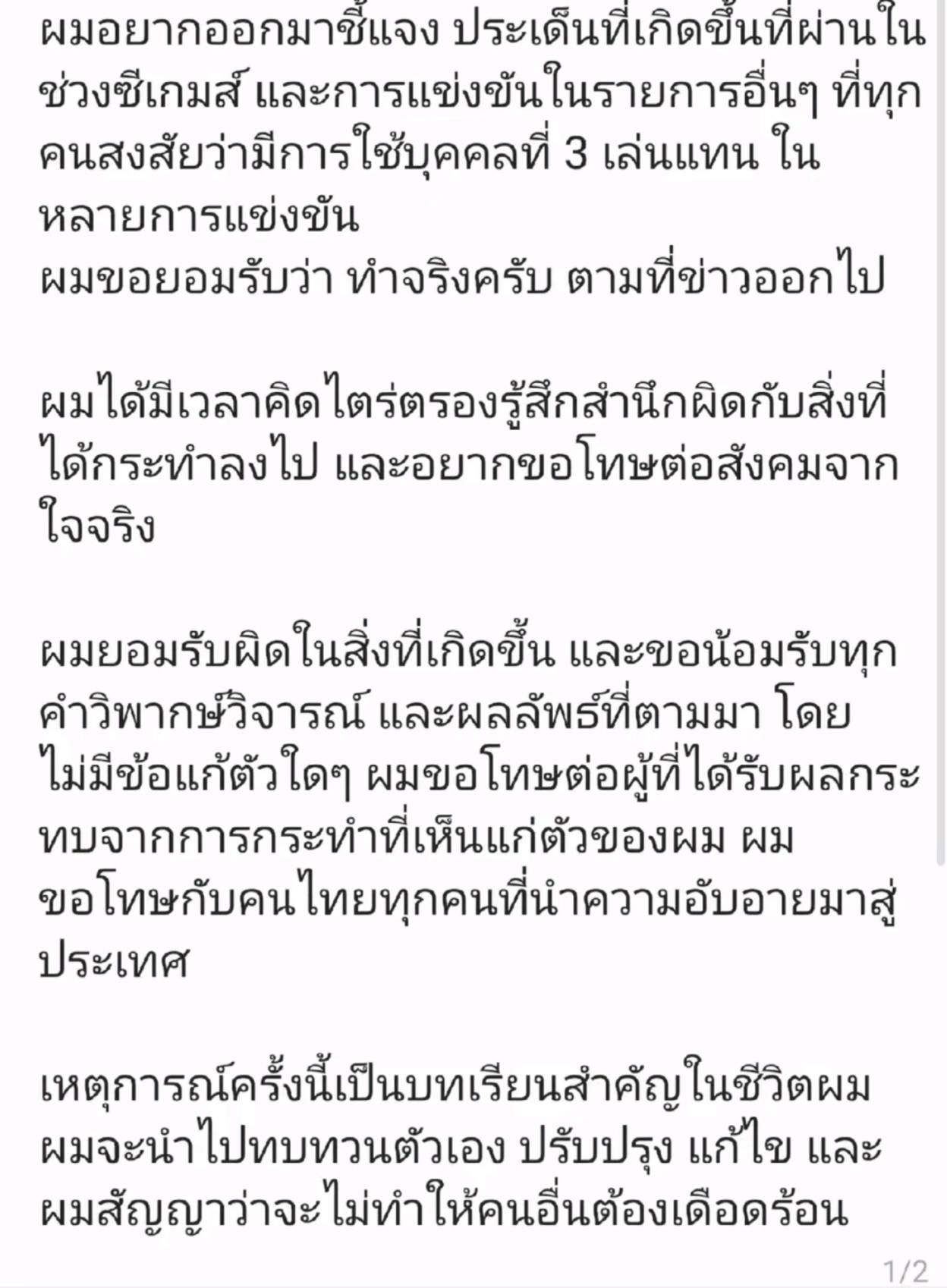 "ผมอยากออกมาชี้แจง ประเด็นที่เกิดขึ้นที่ผ่านมาในช่วงซีเกมส์ และการแข่งขันในรายการอื่นๆ ที่ทุกคนสงสัยว่ามีการใช้บุคคลที่ 3 เล่นแทน ในหลายการแข่งขัน ผมขอยอมรับว่า ทำจริงครับ ตามที่ข่าวออกไป" Cheerio กล่าวผ่าน Tiktok "ผมได้มีเวลาคิดไตร่ตรองรู้สึกสำนึกผิดกับสิ่งที่ได้กระทำลงไป และอยากขอโทษต่อสังคมจากใจจริง"