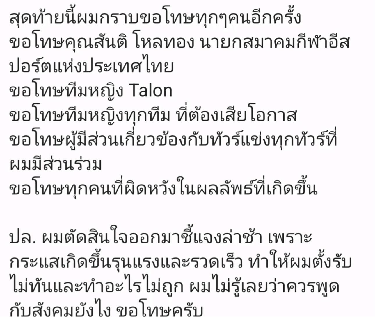 นอกจากนี้เขายังได้กล่าวขอโทษเป็นพิเศษไปยังคุณสันติ โหลทอง นายกสมาคมกีฬาอีสปอร์ตแห่งประเทศไทย รวมถึงทีมหญิง Talon และทีมหญิงทุกทีมที่ต้องเสียโอกาสจากการแข่งขันในครั้งนี้ พร้อมทั้งขออภัยผู้มีส่วนเกี่ยวข้องกับทัวร์นาเมนต์ทุกรายการและแฟนคลับทุกคนที่รู้สึกผิดหวังในตัวเขาและการกระทำที่เกิดขึ้นทั้งหมด