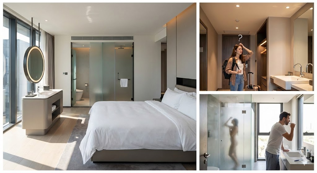 สำหรับโรงแรมที่มีพื้นที่จำกัด การก่อผนังกั้นห้องน้ำแบบเต็มรูปแบบจะทำให้ห้องดูแคบและอึดอัด การเอามุมอ่างล้างหน้าออกมาไว้ข้างนอก จะช่วยลดการใช้พื้นที่ผนังห้องน้ำลง ทำให้พื้นที่รวมของห้องพักดูโล่ง โปร่ง และกว้างขวางขึ้นในทางสายตา แถมยังใช้พื้นที่ทางเดินหน้าห้องน้ำให้เกิดประโยชน์สูงสุดด้วย