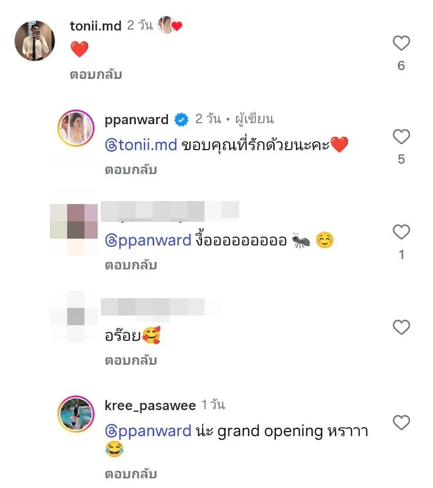 คำตอบสุดหวาน "ขอบคุณที่รักด้วยนะคะ" เป้ยไม่ได้ตอบกลับแบบธรรมดา แต่จัดเต็มความหวานด้วยประโยคที่ว่า "ขอบคุณที่รักด้วยนะคะ" พร้อมตบท้ายด้วยอีโมจิหัวใจสีแดงดวงโต งานนี้ทำเอาเพื่อนสนิทอย่าง "ครี พัสวีพิชญ์" ถึงกับนั่งไม่ติด ต้องรีบเข้ามาคอมเมนต์แซวแรงทันทีว่า "น่ะ grand opening หราาา"