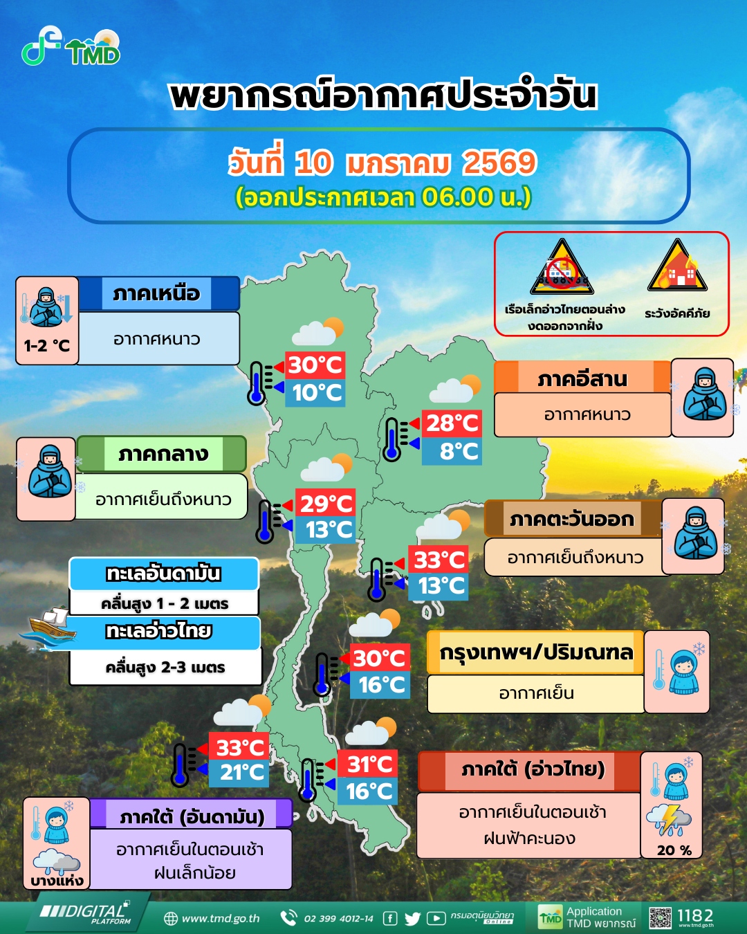 วันนี้ (ุ10 ม.ค.) กรมอุตุนิยมวิทยา พยากรณ์อากาศ 24 ชั่วโมงข้างหน้า ประเทศไทยตอนบนยังคงมีอากาศหนาวเย็น เนื่องจากบริเวณความกดอากาศสูงหรือมวลอากาศเย็นกำลังแรงจากประเทศจีนปกคลุมประเทศไทยตอนบน ขอให้ประชาชนดูแลรักษาสุขภาพเนื่องจากสภาพอากาศที่หนาวเย็นลง รวมทั้งให้ระวังอันตรายจากอัคคีภัยเนื่องจากสภาพอากาศแห้งและลมแรง