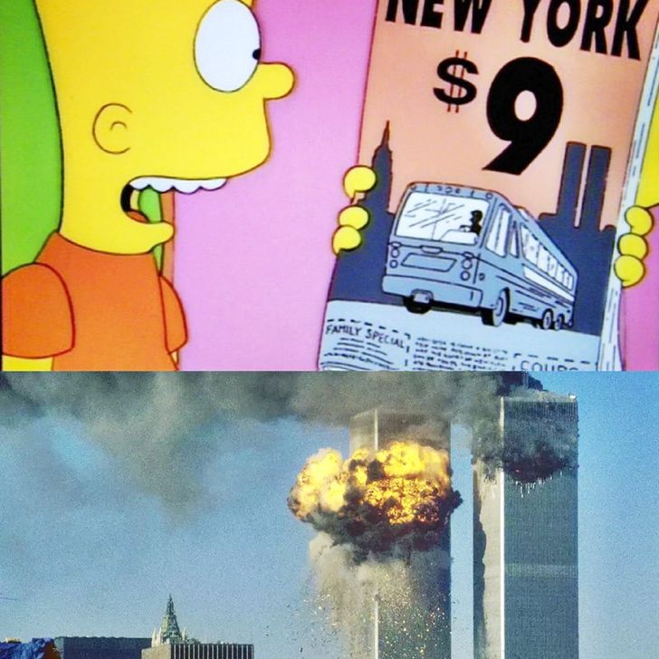 เหตุการณ์นี้ปรากฏในตอน "The City of New York vs. The Homer Simpsons" ปี 1997 โดยเนื้อหาในตอนนี้คือการที่ครอบครัวซิมป์สันส์เดินทางไปมหานครนิวยอร์กเพื่อตามหารถบ้านที่ถูกขโมยไป ซึ่งมีฉากที่ลิซ่าเห็นโฆษณาบนรถบัสไปนิวยอร์กในราคา 9 ดอลลาร์ และหากสังเกตดี ๆ จะเห็นตึกคู่ World Trade Center อยู่ข้างเลข 9 ซึ่งทำนายถึงเหตุการณ์ 9/11 ที่เกิดขึ้นจริงในวันที่ 11 กันยายน 2001 หลังจากตอนนี้ออกฉายได้ 4 ปี และในเหตุการณ์จริงตึกคู่นี้ก็ถูกทำลายลง ทำให้ตอนนี้ถูกห้ามฉายไปช่วงหนึ่ง