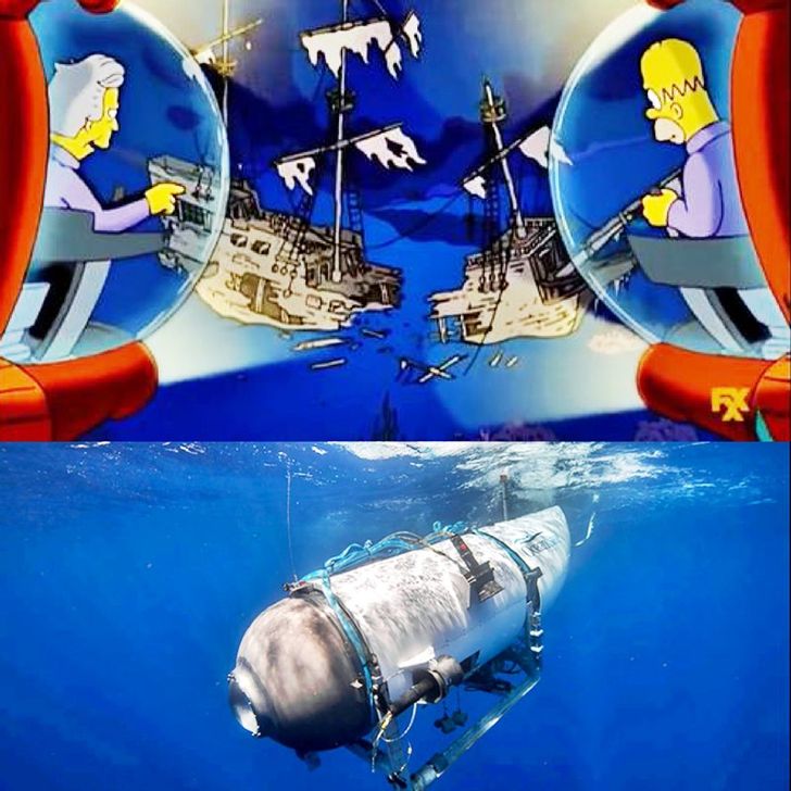 เหตุการณ์การสูญหายของเรือดำน้ำไททันในระหว่างการเดินทางไปชมซากเรือไททานิค ซึ่งเหตุการณ์นี้ถูกทำนายในตอน "Homer’s Paternity Coot" ปี 2006 โดยตอนนี้เล่าถึงโฮเมอร์ที่ขับเรือดำน้ำลงไปงมซากเรือใต้มหาสมุทร จนเกิดเหตุขัดข้องและต้องใช้เวลา 3 วันในการเอาชีวิตรอดกลับขึ้นมาสู่ผิวน้ำ ในตอนนี้จบแบบมีความสุข แต่ในชีวิตจริงเหตุการณ์ในปี 2023 กลับจบลงด้วยความเศร้า ลูกเรือทั้ง 5 คนเสียชีวิต