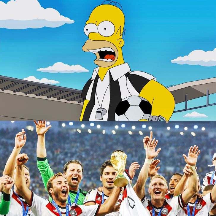 ในตอน "You Don’t Have to Live Like a Referee" ปี 2014, โฮเมอร์ได้คาดการณ์การชิงแชมป์ฟุตบอลโลกระหว่างเยอรมนีและบราซิล แต่สุดท้ายคู่ชิงกลับกลายเป็นเยอรมนี vs อาร์เจนตินา ซึ่งเยอรมนีก็ชนะ และในตอนนี้ยังมีการพูดถึงการคอร์รัปชันภายในองค์กร FIFA ซึ่งก็ถูกจับได้จริงๆ ในปี 2015