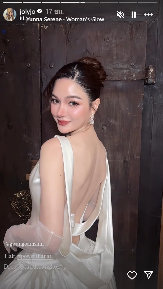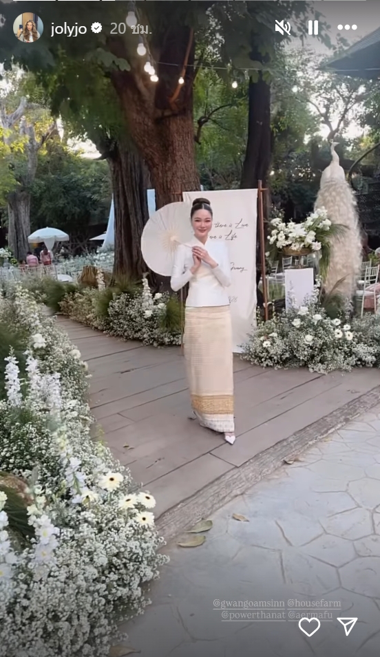 นอกจากลุคละอ่อนในชุดพื้นเมืองแล้ว ในช่วงเลี้ยงฉลองเธอยังเปลี่ยนมาในชุดเจ้าสาวสีขาวบริสุทธิ์ ดีไซน์หวานละมุนแต่ยังคงความโฉบเฉี่ยวด้วยดีเทลเว้าหลังแอบเซ็กซี่เล็กน้อย ตามสไตล์ตัวแม่แฟชั่นนิสต้า