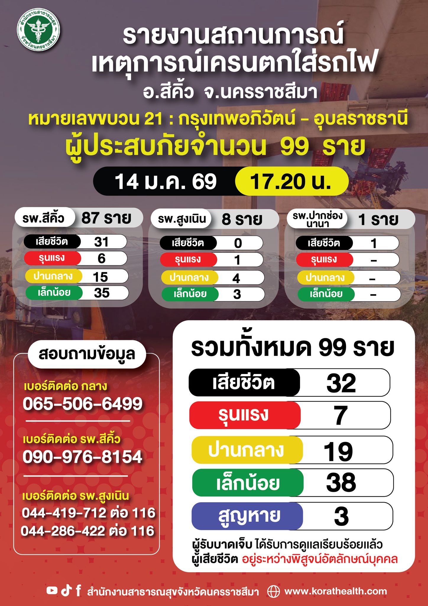 ภาพความเสียหายของตู้รถไฟที่ตกรางและมีร่องรอยเพลิงไหม้ สร้างความสะเทือนใจให้กับทุกคนที่ได้เห็น ล่าสุดทางสำนักงานสาธารณสุขจังหวัดนครราชสีมา ได้สรุปยอดผู้ประสบภัยออกมา
