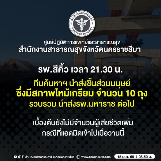 - ทีมค้นหาได้นำส่ง "ชิ้นส่วนมนุษย์" ซึ่งมีสภาพไหม้เกรียมจากการถูกเพลิงไหม้ จำนวน 10 ถุง ส่งต่อไปยังโรงพยาบาลมหาราชนครราชสีมา เพื่อทำการตรวจสอบทางนิติวิทยาศาสตร์ต่อไป