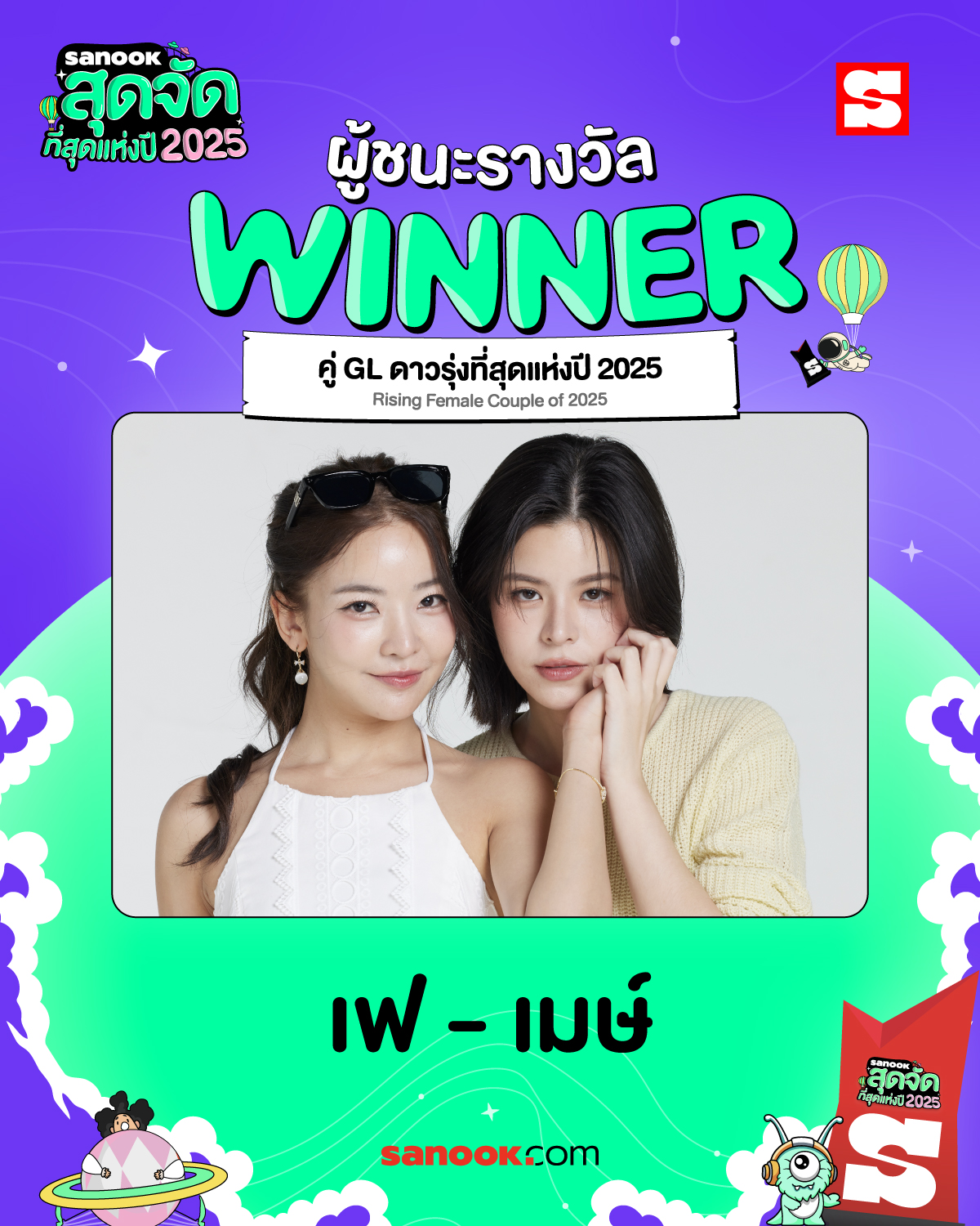 ขอแสดงความยินดีกับ เฟ-เมษ์ นักแสดงดาวรุ่ง คว้ารางวัล “คู่ GL ดาวรุ่งที่สุดแห่งปี 2025” (Rising Female Couple of 2025) จากกิจกรรมโหวตในงาน สนุกสุดจัด 2025 ไปครองได้อย่างงดงาม