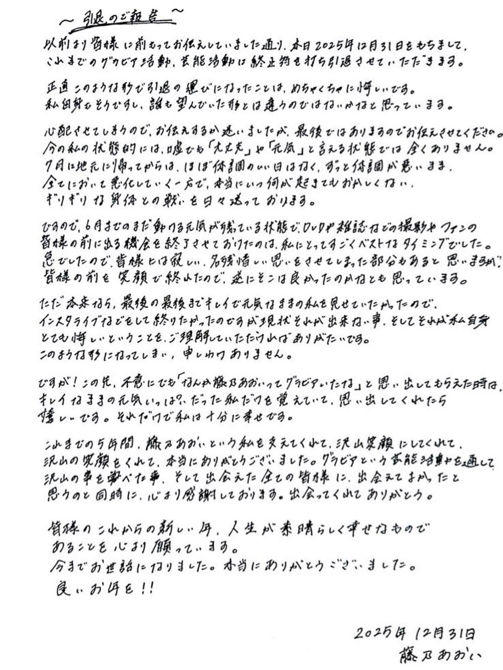 ก่อนหน้านี้ในวันส่งท้ายปีเก่า (31 ธันวาคม 2025) อาโออิได้ประกาศเกษียณวงการอย่างเป็นทางการผ่านทางโซเชียลมีเดียด้วยจดหมายเขียนด้วยลายมือ เนื้อหาในจดหมายสะท้อนให้เห็นถึงอาการป่วยที่รุมเร้า โดยเธอระบุว่า "ในสภาพร่างกายปัจจุบัน ฉันไม่สามารถพูดได้เลยว่าฉันสบายดี แม้จะต้องโกหกก็ตาม ทุกอย่างเริ่มแย่ลง และรู้สึกเหมือนอะไรก็เกิดขึ้นได้ทุกเมื่อ ฉันกำลังต่อสู้กับร่างกายที่มาถึงขีดจำกัดในทุกๆ วัน" ข้อความดังกล่าวสร้างความกังวลให้กับแฟนคลับเป็นอย่างมาก ก่อนที่จะได้รับข่าวร้ายในสัปดาห์ต่อมา โดยในพิธีศพของเธอ ทางครอบครัวได้นำผลงานดีวีดีและโฟโต้บุ๊กของเธอมาจัดแสดงเพื่อรำลึกถึงความสำเร็จในเส้นทางอาชีพด้วย