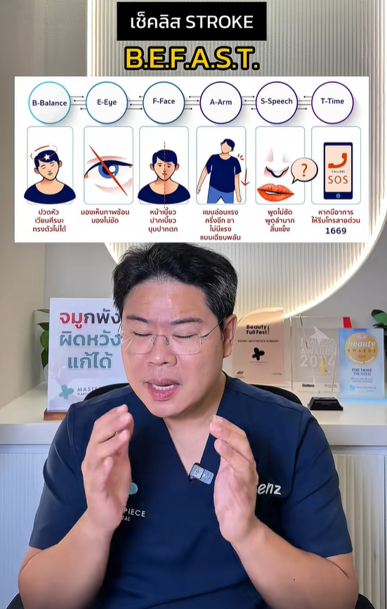 ล่าสุด หมอเบ็นซ์ (Dr. Benz Masterpiece) ได้ออกมาโพสต์คลิปวิเคราะห์อาการดังกล่าวผ่าน TikTok @dr.benz_masterpiece ด้วยความห่วงใย โดยชี้ให้เห็นถึงสัญญาณเตือนทางร่างกายที่อาจเข้าข่ายภาวะ โรคหลอดเลือดสมอง (Stroke) ผ่านหลักการสังเกต B.E.F.A.S.T. พร้อมเจาะลึก 3 จุดสังเกตสำคัญที่ต้องระวัง ดังนี้