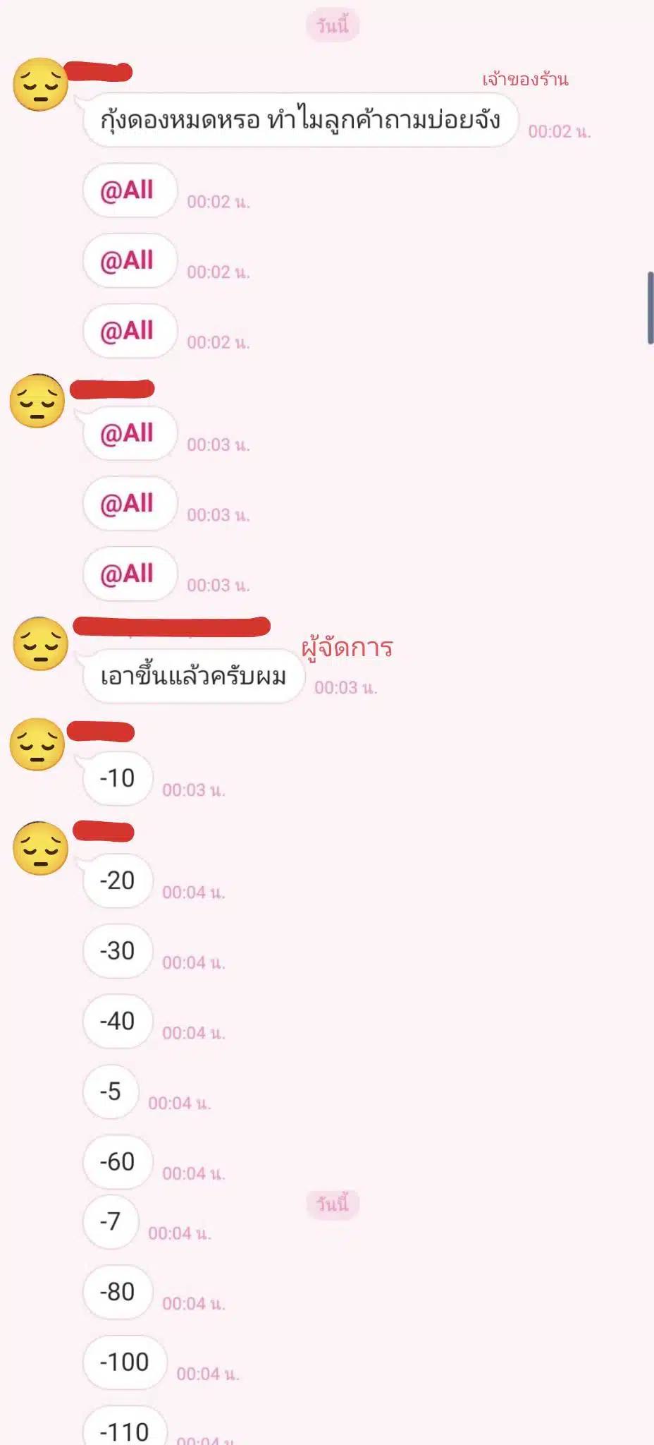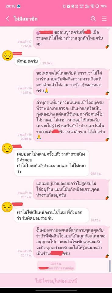 อย่างไรก็ตาม เจ้าของร้านกลับเริ่มพิมพ์ข้อความแจ้งหักเงินค่าจ้างพนักงานเป็นรายวินาที ตั้งแต่หลักสิบไปจนถึงรวมกว่า 200 บาท พร้อมระบุว่าพนักงานทุกคน ทุกกะ จะถูกหักเงินทั้งหมด แม้บางคนจะเลิกงานไปแล้ว วันหยุด หรือไม่ได้อยู่ในกะทำงานช่วงเวลานั้นก็ตาม