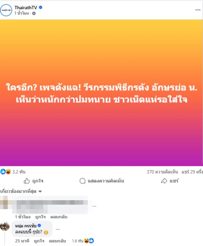 "หนุ่ม กรรชัย" พิธีคนดังแห่งรายการโหนกระแส ได้โผล่คอมเมนต์อย่างฮาว่า ""ลงแบบนี้ กูป่ะ?" (พร้อมอีโมจิรูปกัดปาก)