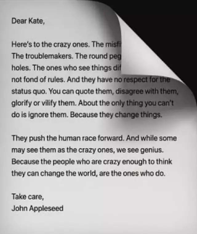 ผู้ใช้งานโซเชียลมีเดียต่างพากันตื่นเต้นเมื่อได้รู้ว่า ข้อความบนกระดาษแผ่นจิ๋วนั้นสามารถอ่านได้เป็นเรื่องเป็นราว โดยขึ้นต้นจดหมายว่า "Dear Kate" (ถึง เคท) และลงท้ายด้วยชื่อ "John Appleseed" ซึ่งเป็นชื่อสมมติที่ Apple มักใช้ในการสาธิตสินค้า แต่ไฮไลต์อยู่ที่เนื้อหาตรงกลาง ซึ่งคัดลอกมาจากแคมเปญโฆษณาในตำนานอย่าง "Think Different" นั่นเอง