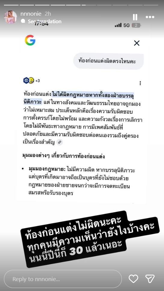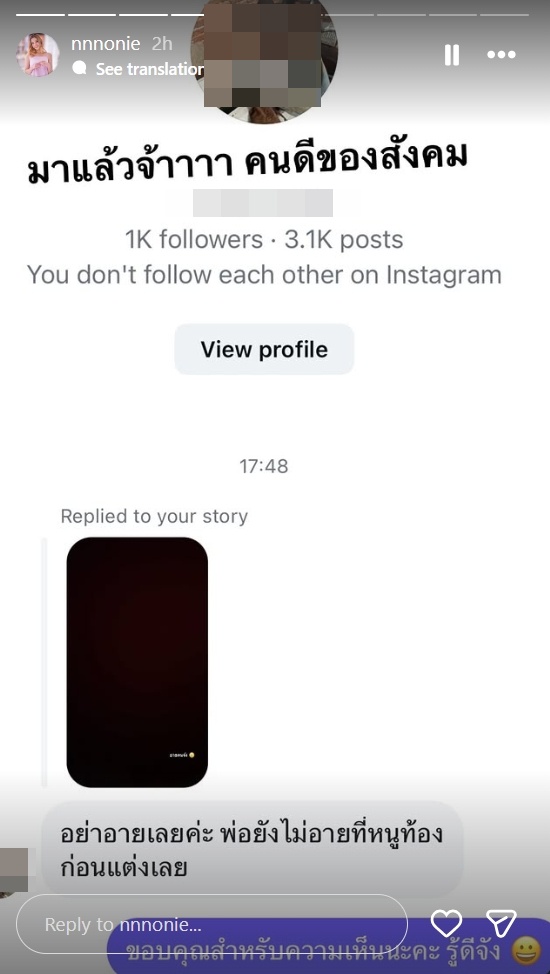 นอกจากนี้เธอยังแคปข้อความที่ชาวเน็ตเข้ามาแขวะเรื่อง "ท้องก่อนแต่ง" โดยเธอก็ตอบกลับสั้นๆ แต่เจ็บจี๊ดว่า "ขอบคุณสำหรับความเห็นนะคะ รู้ดีจัง"