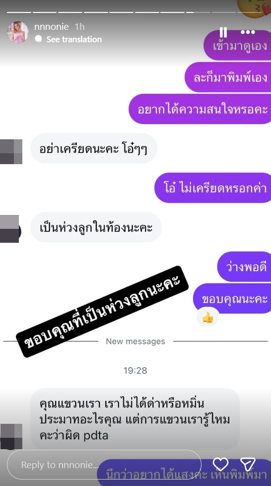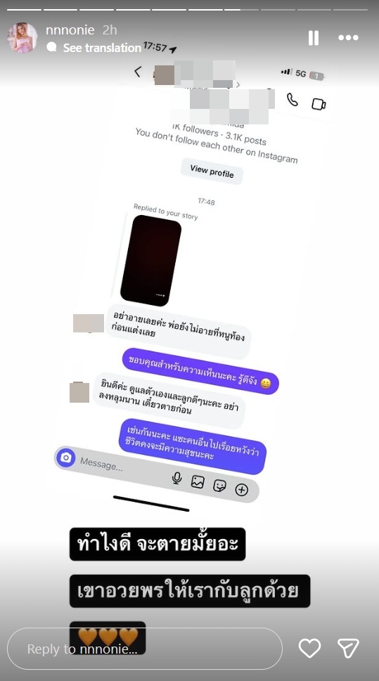 ล่าสุดสถานการณ์บานปลายเมื่อมีชาวเน็ตบางรายล้ำเส้น เข้าไปคอมเมนต์แซะเรื่องส่วนตัวและแช่งเด็กในท้อง จนทำให้นนนี่ถึงกับฟิวส์ขาด โพสต์ข้อความโต้กลับอย่างดุเดือดว่า:
