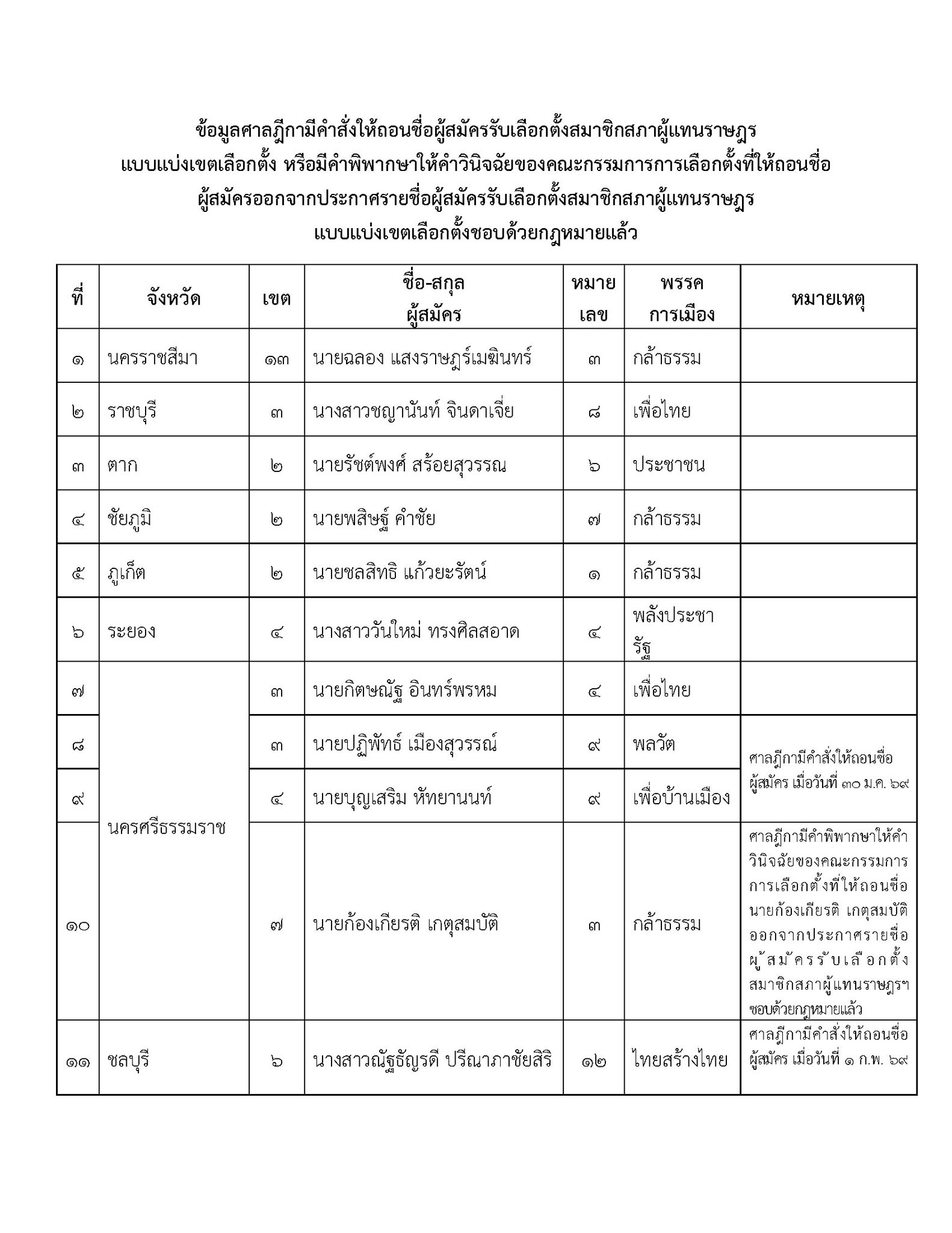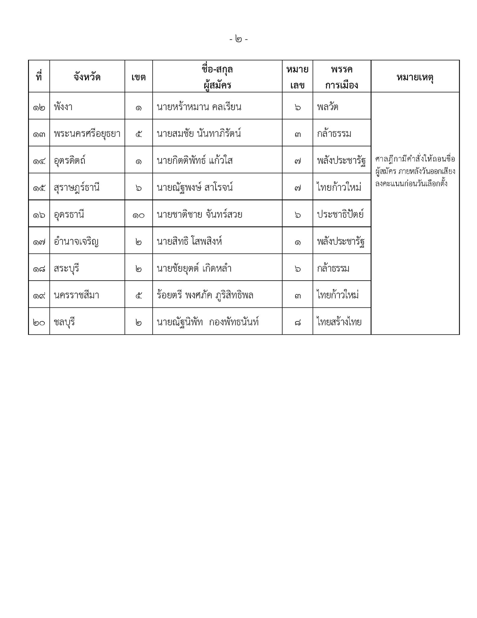 บัดนี้ ศาลฎีกามีคำสั่งให้ถอนชื่อผู้สมัครรับเลือกตั้งสมาชิกสภาผู้แทนราษฎรแบบแบ่งเขตเลือกตั้ง หรือมีคำพิพากษาให้คำวินิจฉัยของคณะกรรมการการเลือกตั้งที่ให้ถอนชื่อผู้สมัครออกจากประกาศรายชื่อผู้สมัครรับเลือกตั้งสมาชิกสภาผู้แทนราษฎร แบบแบ่งเขตเลือกตั้งชอบด้วยกฎหมายแล้ว เพิ่มเติมจำนวน 2 ราย ในลำดับที่ 19 และ 20 รวมทั้งสิ้น 20 ราย รายละเอียดตามเอกสารแนบ