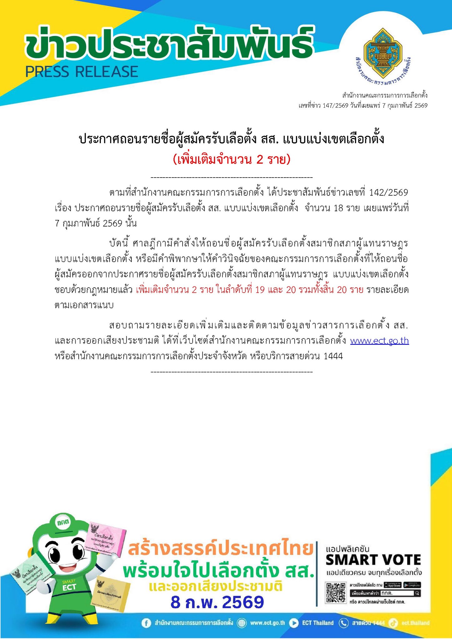 ตามที่สำนักงานคณะกรรมการการเลือกตั้ง ได้ประชาสัมพันธ์ข่าวเลขที่ 142/2569 เรื่อง ประกาศถอนรายชื่อผู้สมัครรับเลือตั้ง สส. แบบแบ่งเขตเลือกตั้ง จำนวน 18 ราย เผยแพร่วันที่ 7 กุมภาพันธ์ 2569 นั้น